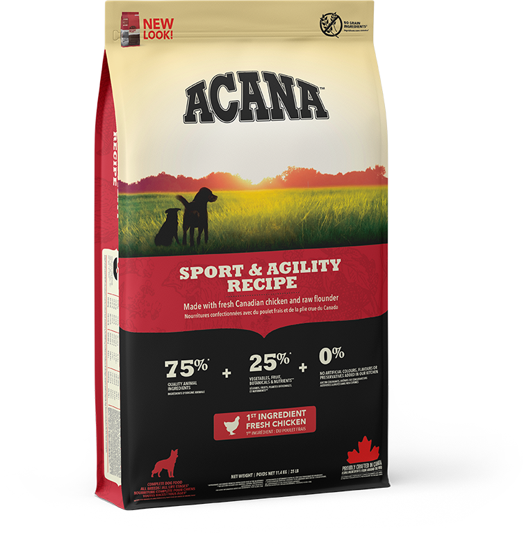 Che si tratti di pascolare le pecore o di giocare a palla, i cani sportivi hanno un fabbisogno particolarmente elevato di proteine e grassi naturali per mantenersi in buone condizioni. ACANA SPORT & AGILITY fornisce il 35% di proteine e il 22% di grassi provenienti da ingredienti freschi e regionali come pollame e pesce.